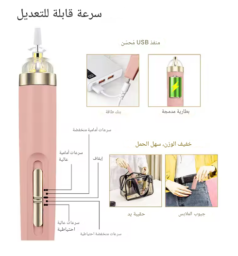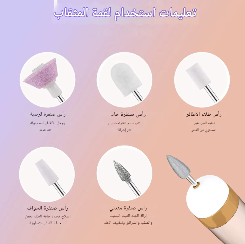 تأتي مع خمس رؤوس عناية بالأظافر قابلة للتبديل، مما يسمح بتقشير سطح الأظافر، وإزالة الجل، والحفاظ على الأظافر في حالة من النظافة والجمال بسرعة وبسهولة أكبر! إنها تلمع الأظافر بسهولة وتتركها لامعة وجميلة!