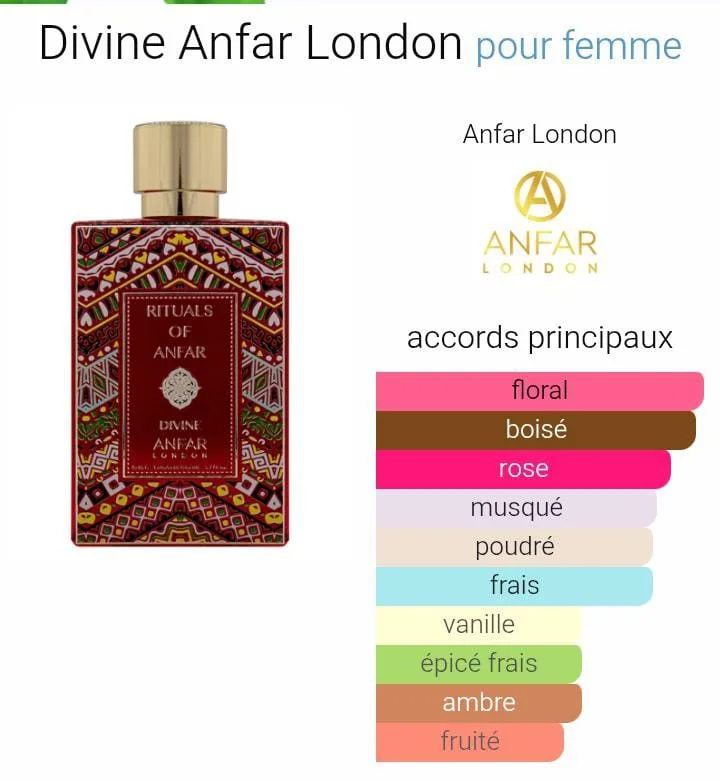 ديفاين من أنفار لندن عطر زهري للنساء. أُطلق ديفاين عام ٢٠٢٢. أحمد الله أنفار هو من ابتكر هذا العطر. مكوناته العليا هي الليتشي، الورد، البرغموت، وجوزة الطيب؛ مكوناته الوسطى هي الفانيليا، الفاوانيا، المسك، والبتاليا؛ مكوناته الأساسية هي الكاشميران، نجيل الهند، البخور، والأرز.