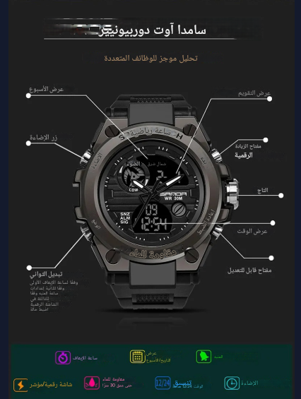 هذه الساعة من نوع SANDA وهي ساعة رياضية متعددة الوظائف.
